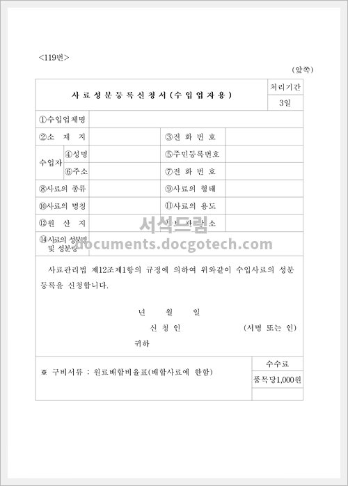 - 관련 문서 : 사료성분등록 신청서와 함께 해당 사료에 대한 기술적인 자료나 검증 보고서 등의 다른 문서를 첨부해야 합니다.