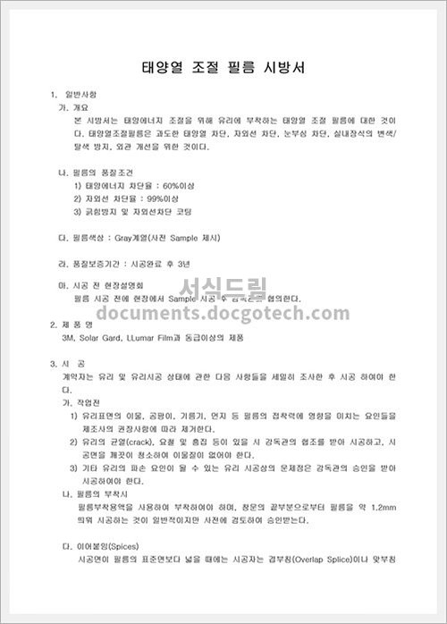 태양열 조절 필름 시방서는 태양열 시스템 설치 혹은 유지보수 작업 시 사용되는 문서입니다. 이 문서를 작성함으로써 설치 및 유지보수 작업의 효율성을 높일 수 있으며, 작업자들이 필요한 정보를 쉽게 얻을 수 있게 해줍니다. 아래는 이 문서 작성시 유의사항 몇 가지입니다.