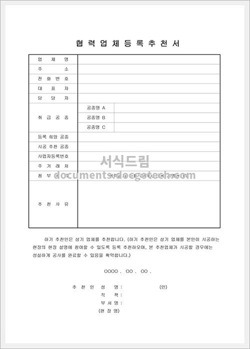 - 구체적인 사례 : 추천서 작성 시 종합적인 내용보다는 구체적인 협력 결과나 성과를 강조해야 합니다. 구체적인 사례를 제시하여 추천을 받을 협력업체의 역량과 신뢰성을 증명합니다.