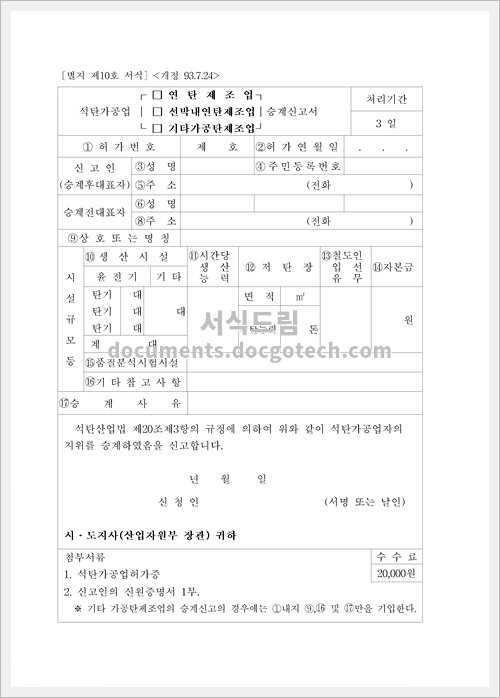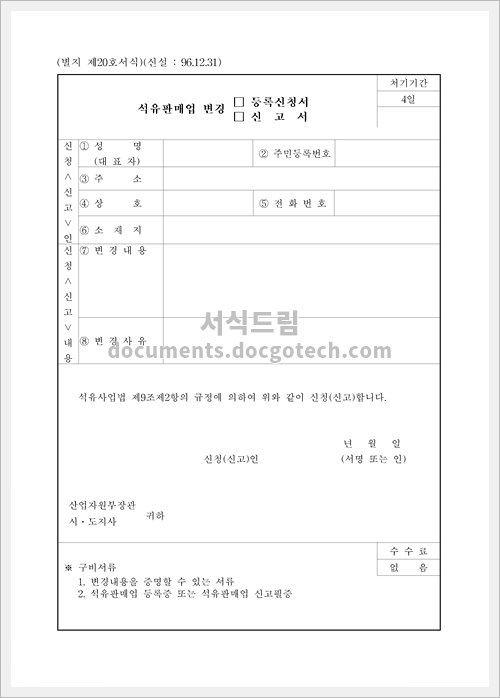 석유 판매업변경 (등록 신청서 신고서)의 사용용도, 작성시 유의사항 석유 판매업변경 (등록 신청서 신고서)는 석유 제품을 판매하는 사업자가 사업 내용을 변경하여 신고 및 등록을 하기 위해…