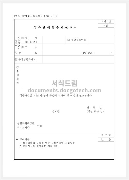 석유 판매업승계 신고서 사용용도와 작성시 유의사항 석유 판매업승계 신고서는 석유 판매사업자가 판매업의 승계 또는 인수를 신고하는 문서입니다. 이 신고서는 법적으로 요구되는 절차 중 하나이며, 판매업…