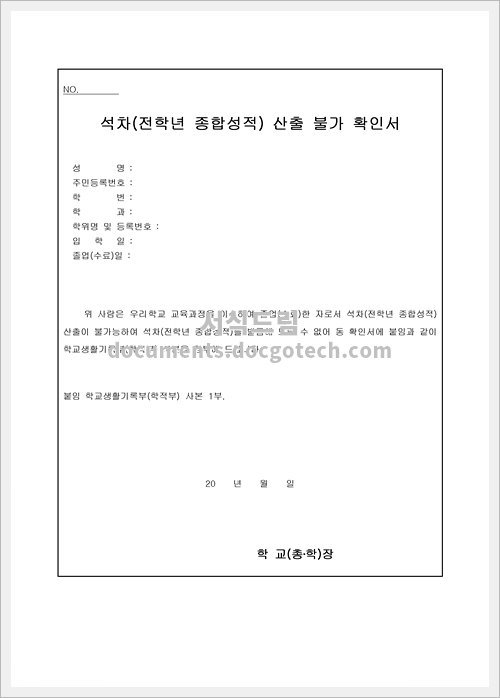 석차 산출 불가 확인서에 대하여 석차 산출 불가 확인서는 일부 학생이나 개인의 성적이나 순위를 산출할 수 없음을 확인하기 위해 사용되는 문서입니다. 이 문서는 주로 학교나…