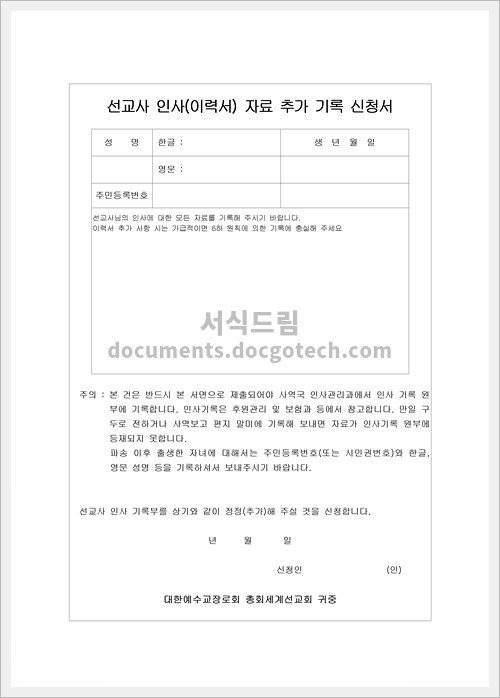 선교사 이력서 자료 추가 기록 신청서 사용 방법 및 유의사항 사용 용도 선교사 이력서 자료 추가 기록 신청서는 선교사 지원자의 이력서에 추가적인 사항을 기록할 수…