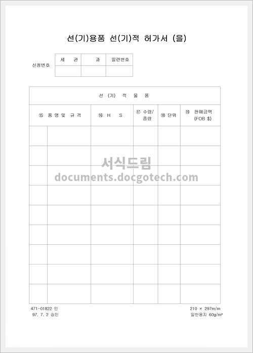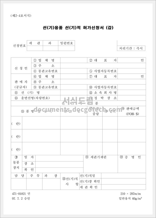 선(기)용품선(기)적허가 신청서 (갑)의 사용용도, 작성시 유의사항 선(기)용품선(기)적허가 신청서 (갑)은 선박 및 기계류와 관련된 품목의 수입 및 수출을 위해 제출되는 문서입니다. 이 신청서는 해당 품목의 제조,…