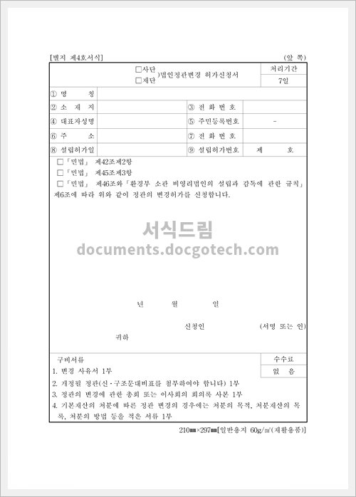 사단법인정관변경 허가 신청서 사용용도 및 작성시 유의사항 사단법인정관변경 허가 신청서 사용용도 사단법인정관변경 허가 신청서는 기존에 등록된 사단법인의 정관을 변경하려는 경우에 제출하는 양식입니다. 정관은 사단법인의 핵심…
