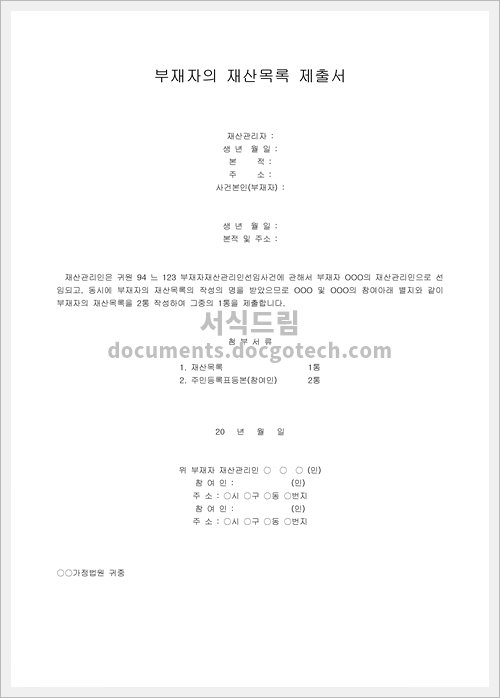 부재자의 재산목록 제출서에 대하여 부재자의 재산목록 제출서는 부재자가 장기간 부재하거나 사망한 경우, 해당 개인의 재산에 대한 목록을 작성하여 제출하는 문서입니다. 이 문서는 법적으로 필요한 경우에…