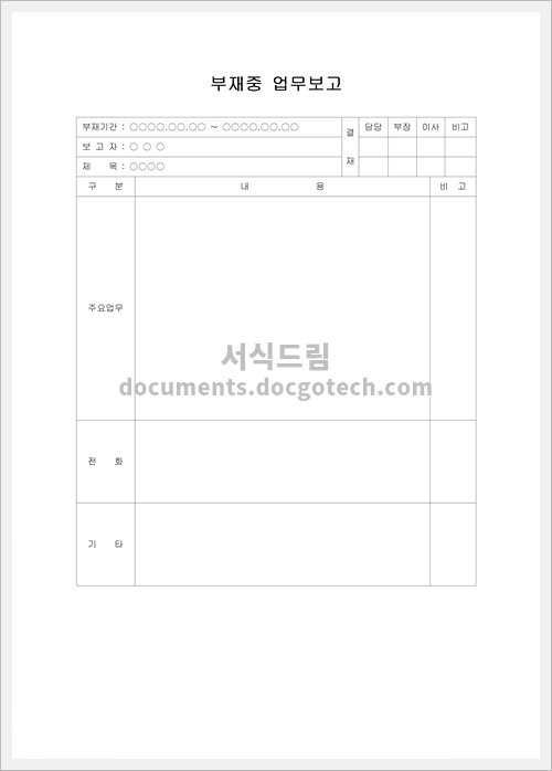 부재중 업무 보고의 사용용도와 작성 유의사항 부재중 업무 보고는 조직 내에서 일어나는 장기간의 부재, 출장, 휴가 등으로 인해 업무를 대신할 임시 담당자에게 업무의 진행 상황과…