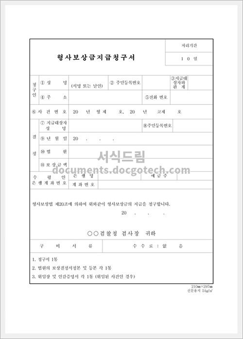 형사보상금 지급 청구서 작성 가이드 형사보상금 지급 청구서는 범죄 피해자가 범인을 검거 또는 처벌해주기 위해 제출하는 서류입니다. 다음은 해당 청구서 작성시 유의사항입니다. 사용용도 1. 형사보상금…