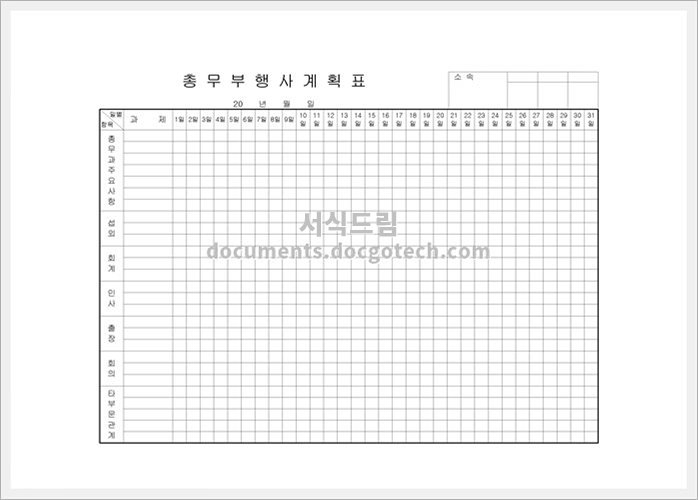 총무부행사 계획표에 대하여 총무부행사 계획표는 회사나 조직 내에서 행사를 개최할 때 사용되는 문서입니다. 이 문서는 행사의 일정과 준비사항을 체계적으로 관리하고 기록하기 위해 사용됩니다. 사용용도 작성시…