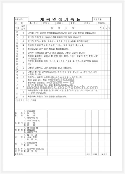채용 면접 기록표의 사용용도와 작성 시 유의사항 채용 면접 기록표 사용용도 채용 면접 기록표는 면접 과정에서 발생하는 정보를 정리하고 추후에 참고하기 위해 사용됩니다. 주요 사용…