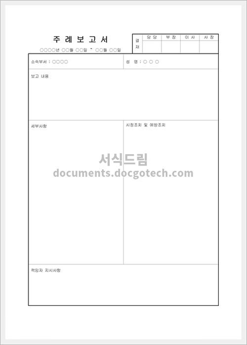 주례 보고서 작성 가이드 주례 보고서의 사용 용도 주례 보고서는 회의, 회의록, 프로젝트 업무 등을 정리하고 문서로 작성하는 것을 말합니다. 이는 업무의 추이를 기록하고 결과를…