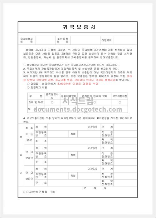 귀국 보증서 – 사용용도 및 작성시 유의사항 귀국 보증서는 국내나 해외에서 귀국하는 사람이 해당 국가에서 정당한 이유 없이 체류를 연장하거나 법적인 문제를 일으키지 않고 시정할…