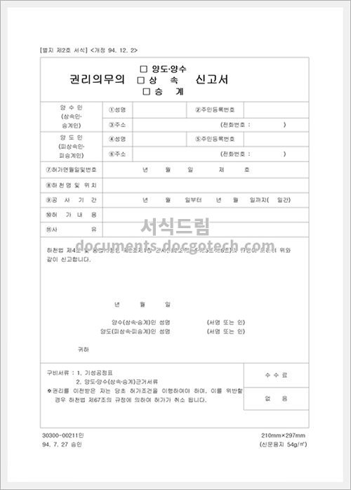 권리의무의양도,양수,상속,승계 신고서의 사용용도, 작성시 유의사항 권리의무의양도,양수,상속,승계 신고서는 법적인 권리와 의무가 소유자 간에 이전되거나 상속되는 경우 사용하는 문서입니다. 이들 신고서는 다음과 같은 용도로 사용됩니다. 권리의양도 :…