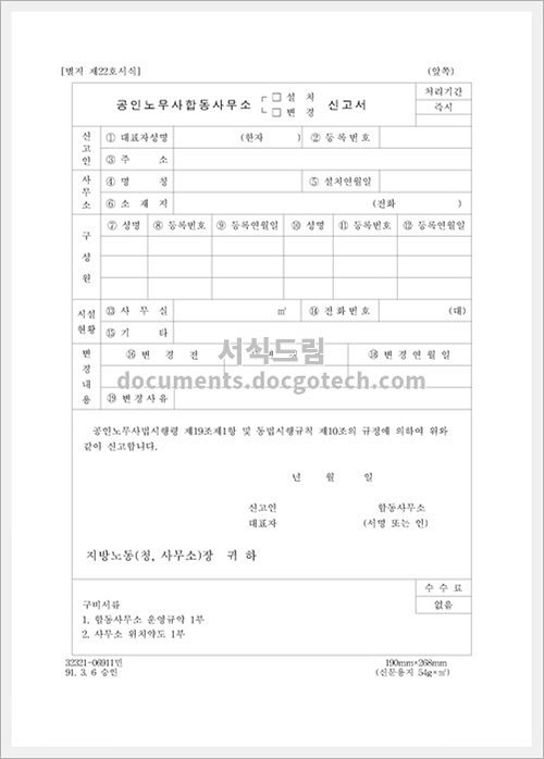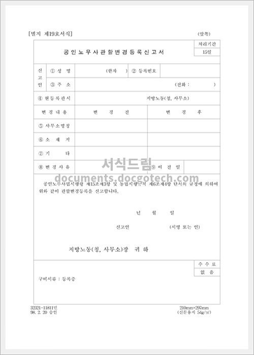 공인노무사관할변경등록 신고서 사용용도 공인노무사관할변경등록 신고서는 공인노무사가 국가인적사항의 변경 또는 당해 지사에서 직원을 고용하는 경우에 작성하여 제출하는 문서입니다. 이 신고서를 통해 공인노무사가 신고한 사항에 따라 인력관리…
