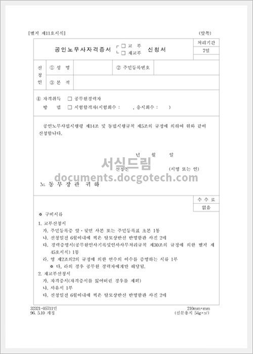 공인노무사자격증서(교부, 재교부) 신청서 작성 가이드 공인노무사자격증서의 사용용도 공인노무사자격증서(교부, 재교부)는 노동법무서비스를 제공하는 직업인인 공인노무사가 갖추어야 하는 자격증입니다. 공인노무사자격증은 노동법무관계 법령에 따라 취업 시 필요한 자격증으로, 노동갈등…