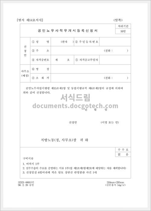 공인노무사사무소설치 신고서의 사용용도, 작성시 유의사항 사용용도 공인노무사사무소설치 신고서는 공인노무사가 사무소를 설치하기 위해 제출하는 서류입니다. 이 서류는 공인노무사가 법적으로 사무소를 설치하고 운영할 수 있는 자격을 갖추고…