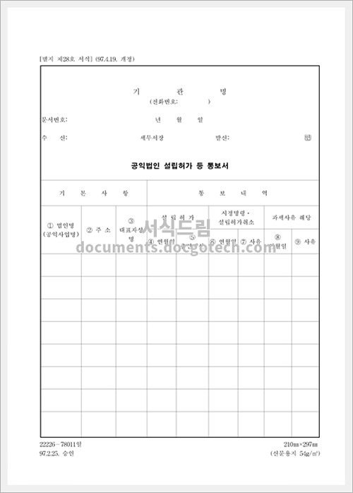 공익법인 설립허가 등 통보서 사용용도와 작성시 유의사항 통보서 사용 용도 공익법인 설립허가 등 통보서는 공익법인 설립허가나 변경 통보의 내용을 알리기 위해 사용되는 문서입니다. 주로 공익법인…